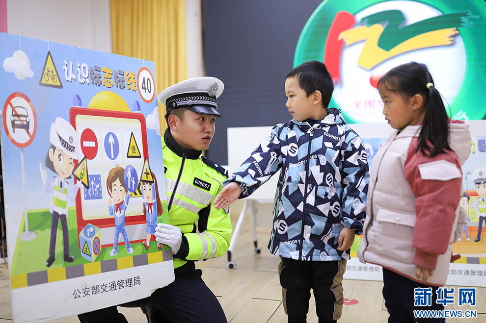 12月1日,在贵州省黔东南苗族侗族自治州丹寨县第二幼儿园,丹寨县公安局交通警察大队民警与小朋友互动,讲解常见的交通标识。新华网发(陆德华 摄)