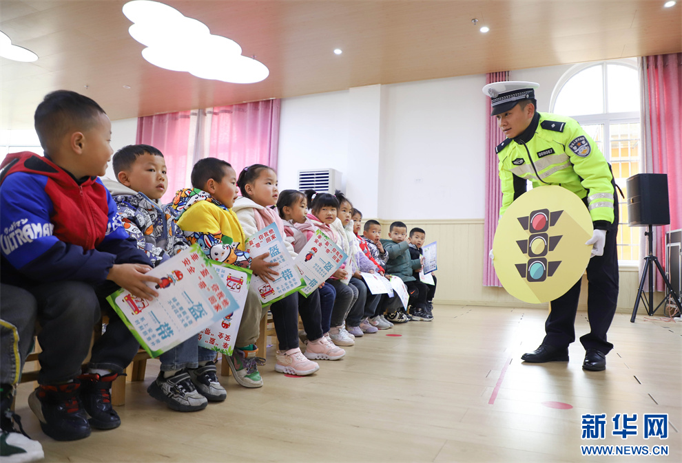 12月1日,在贵州省黔东南苗族侗族自治州丹寨县第二幼儿园,丹寨县公安局交通警察大队民警向小朋友讲解交通安全知识。新华网发(陆德华 摄)