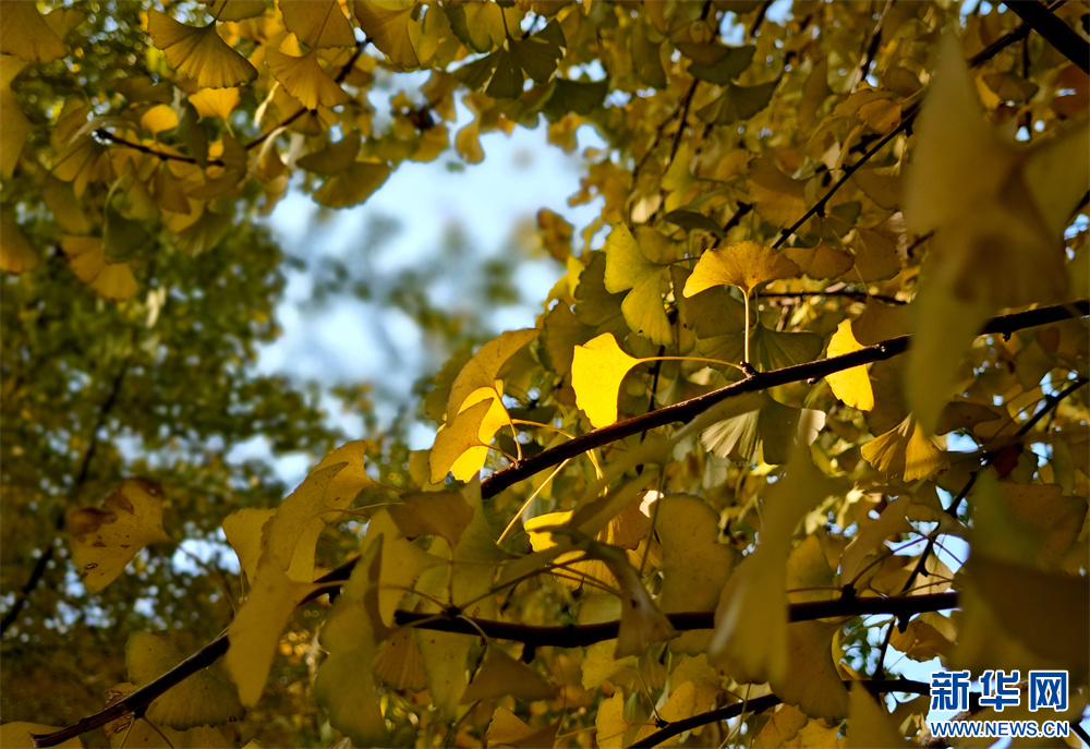 12月4日,在赤水市金华街道滨东社区银杏广场,冬日暖阳下,银杏正“换装”。新华网发(张浪摄)
