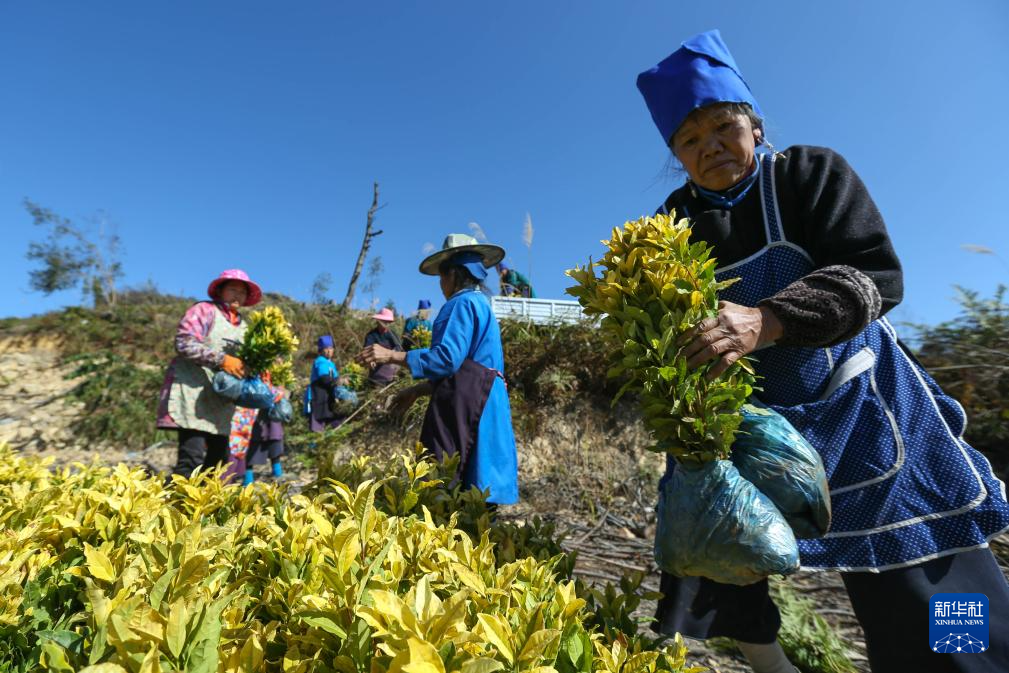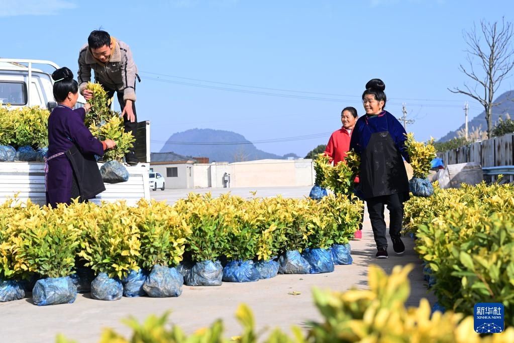 12月7日,工作人员在贵州省黔东南苗族侗族自治州丹寨县一家茶企搬运茶苗。