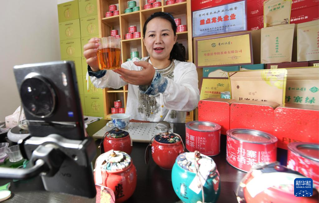 12月7日,工作人员在贵州省黔东南苗族侗族自治州丹寨县一家茶企的电商直播间推介红茶。新华社记者 杨楹 摄