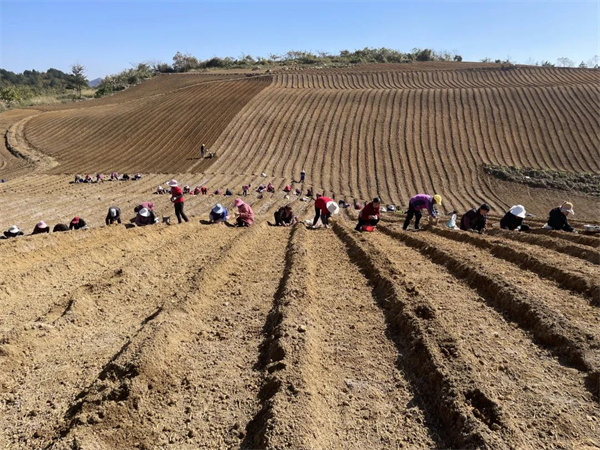 时下正值农闲时节,在新巴镇乐邦村的荒山上却人头攒动,热闹非凡;工人们整齐排列,依次俯身劳作,投身在中药太子参的种植中。