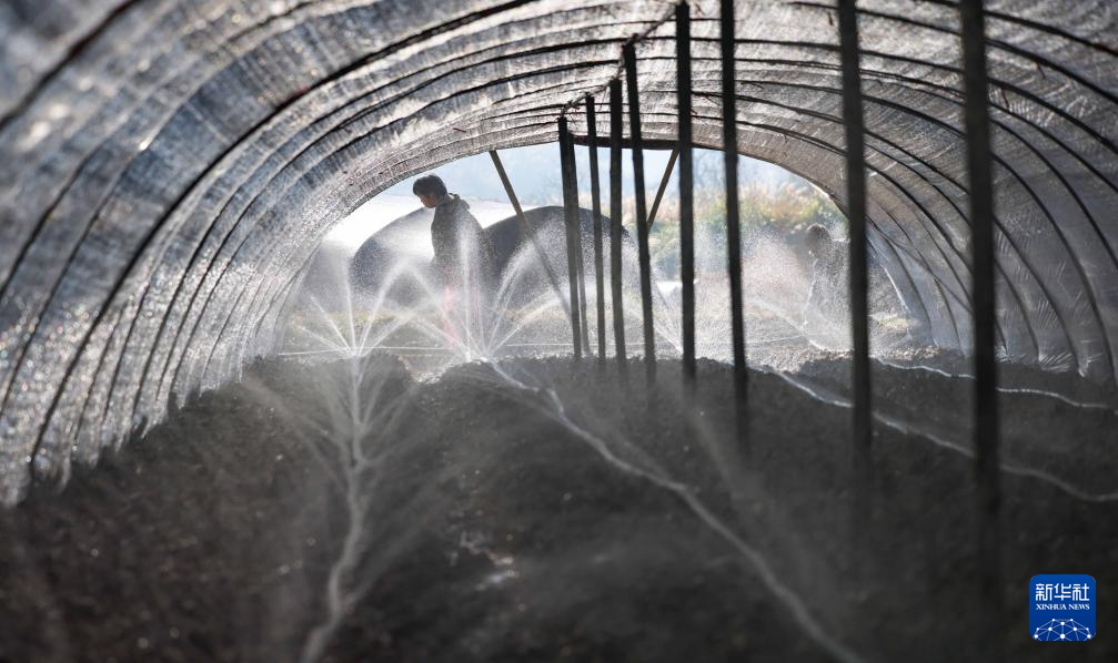 12月7日,贵州省铜仁市玉屏侗族自治县朱家场镇街上村农民给羊肚菌浇水。