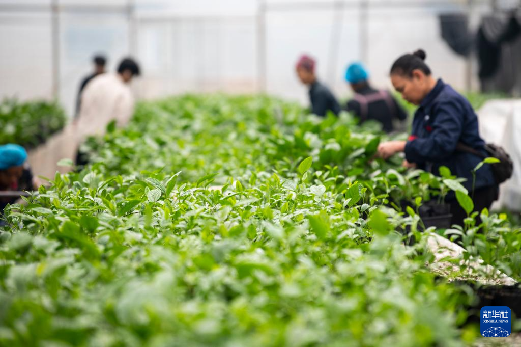 12月7日,在贵州省从江县贯洞镇百香果产业示范园种苗繁育中心,工人在嫁接百香果苗。新华社发(吴德军 摄)