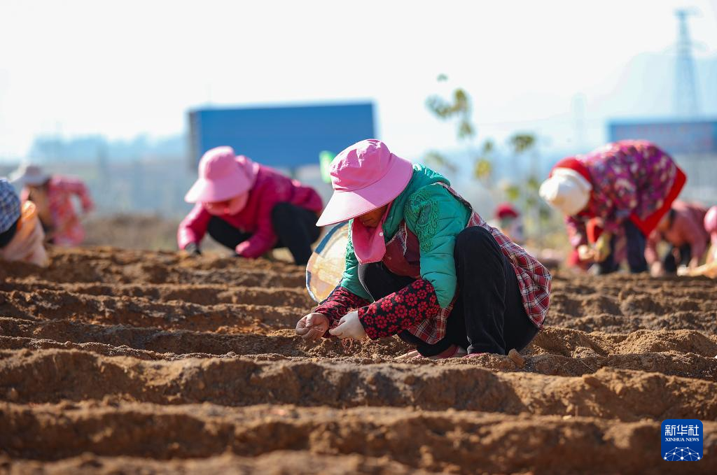 12月7日,贵州省黔东南苗族侗族自治州丹寨县兴仁镇甲脚村村民在播种中药材太子参。新华社发(黄晓海 摄)