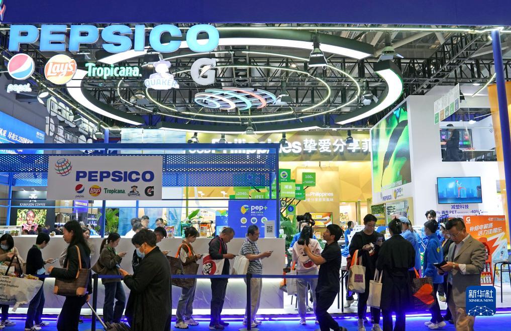 2023年11月8日在第六届进博会食品及农产品展区拍摄的百事公司展台。今年是百事公司首次参展进博会。新华社记者 刘颖 摄