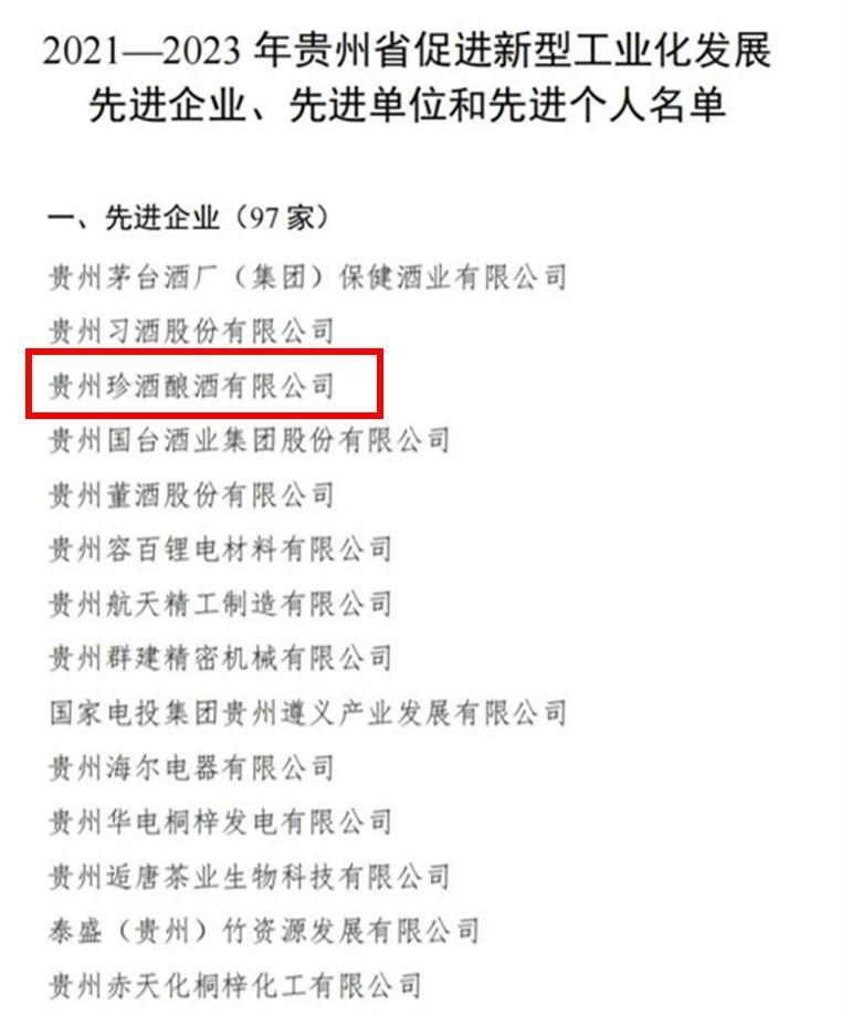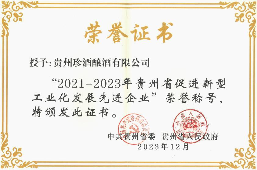 新华社客户端贵州频道电 12月6日,贵州省新型工业化推进大会在贵阳召开,贵州省委、省政府对2021-2023年度贵州省推进新型工业化发展的先进企业、先进单位和先进个人进行表彰。贵州珍酒酿酒有限公司从全省工业企业中脱颖而出,与贵州茅台酒厂(集团)保健酒业有限公司、贵州习酒股份有限公司等同获“2021-2023年贵州省促进新型工业化发展先进企业”称号。这是继11月16日获第四届贵州省省长质量奖提名奖以来,珍酒在一个月内获得的第二个省级重要表彰。