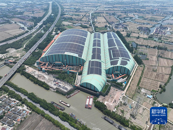 这是江苏苏州市常熟市龙腾特种钢有限公司码头料场屋顶光伏(无人机照片,2023年6月9日摄)。新华社记者 季春鹏 摄