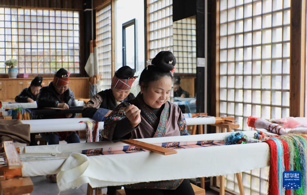 12月15日,绣娘在贵州省黔东南苗族侗族自治州施秉县一家苗绣企业生产车间赶制苗绣产品。新华社发(邰胜智摄)