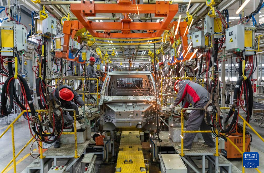 12月15日,工人在贵州省铜仁市万山区一家汽车制造企业的焊装车间作业。新华社发(彭俊摄)