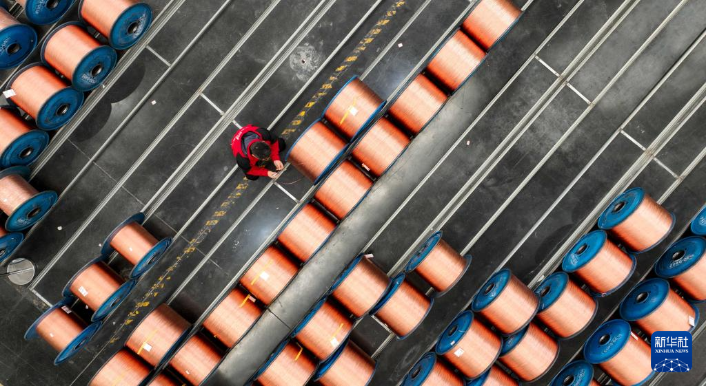 12月15日,工人在贵州省贵阳市观山湖区一家电缆生产企业的车间内点验铜丝(无人机照片)。新华社发(袁福洪摄)