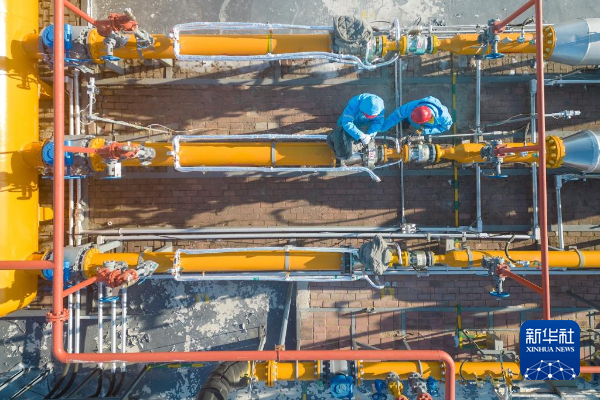 12月17日,黑龙江省哈尔滨市中庆燃气有限责任公司成高子门站的工作人员在进行设备巡检,保障燃气供应(无人机照片)。新华社记者 张涛 摄