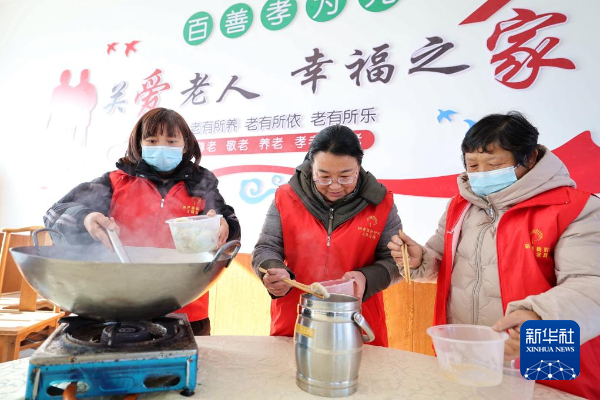 12月17日,在山东省临沂市沂南县铜井镇杜山社区孝善食堂,志愿者们在为社区内独居和行动不便的老人煮水饺。新华社发(王彦冰 摄)