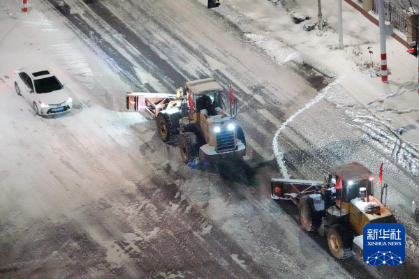 12月16日,大型机械在山东省烟台市高新区街头清理道路积雪。新华社发(唐克 摄)