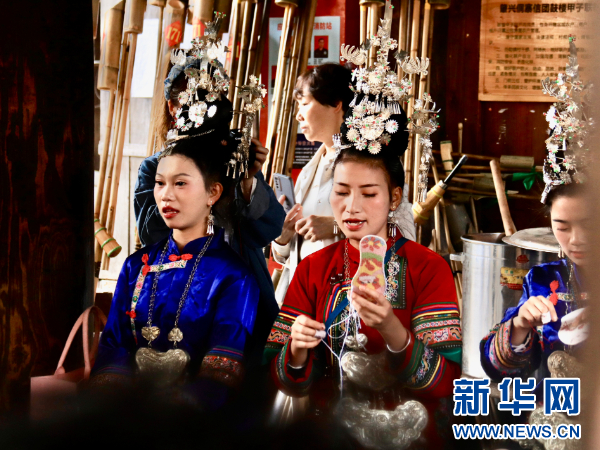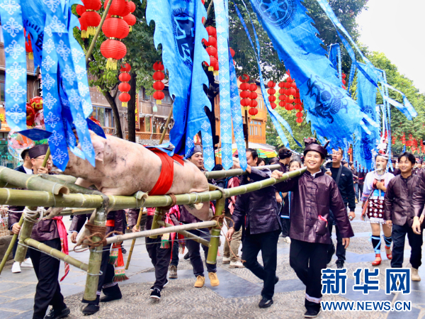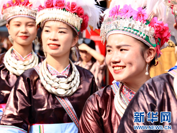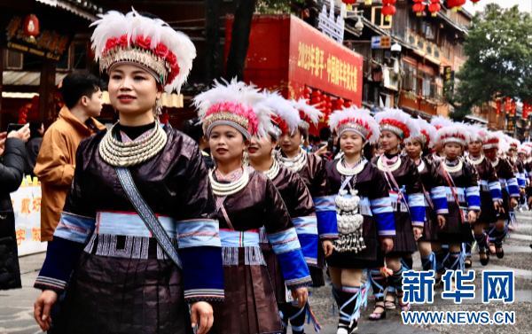 在贵州省黎平县肇兴侗寨,侗族群众身穿节日盛装参加巡游,展示多彩民族文化。新华网发(龙建睿 摄)