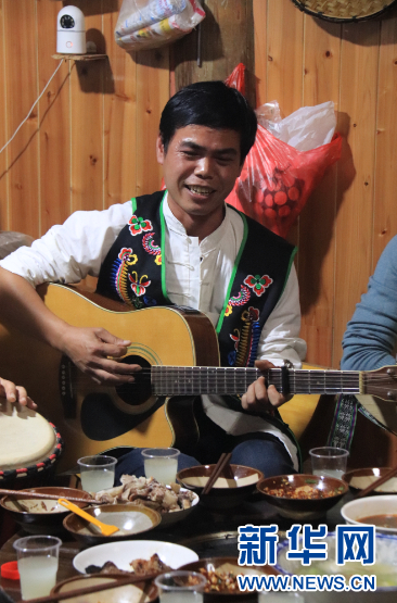 饭桌上当地侗族男子起调唱侗歌。新华网发(方永琼 摄)