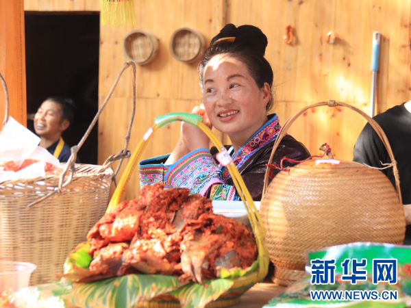 侗族妇女在集市上卖自家产的腌鱼。新华网发(方永琼 摄)