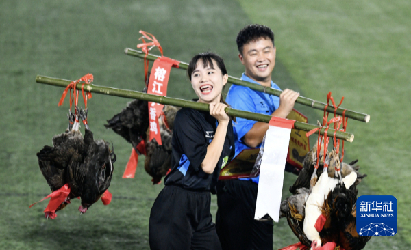 裁判员展示“村超”执裁奖品——榕江小香鸡