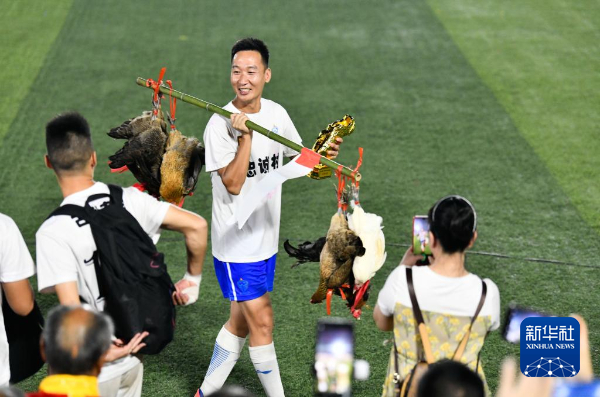 7月29日,忠诚村足球队球员董永恒展示“村超”最佳射手奖品——榕江小香鸡。新华社记者 杨文斌 摄