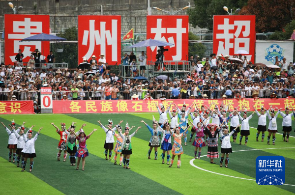 8月13日,演员在“村超”比赛间隙进行表演。新华社记者 刘续 摄