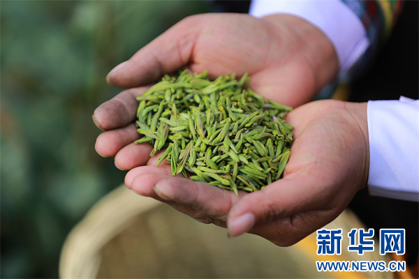 1月1日,普安当地茶农展示刚刚采摘的绿茶。新华网 卢志佳 摄