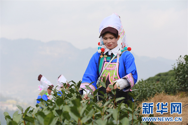 1月1日,普安县当地的布依族茶农在茶园中进行新年“第一采”。新华网 卢志佳 摄