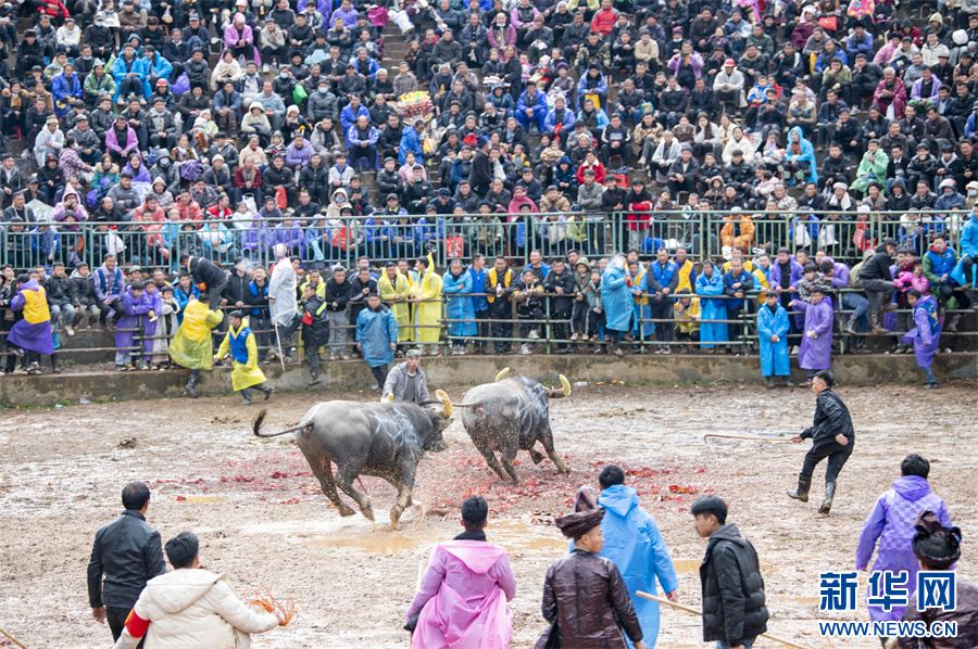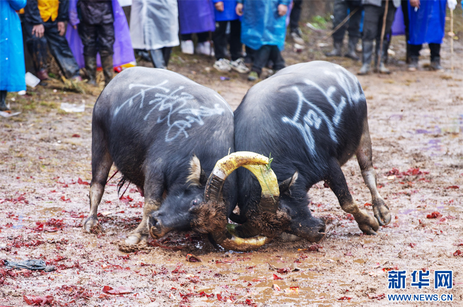1月2日,在贵州省从江县丙妹镇大塘村松学斗牛塘,两头斗牛在打斗。新华网发(吴德军 摄)