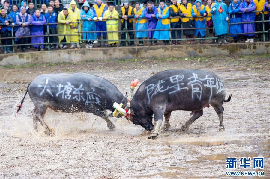当日,贵州省黔东南苗族侗族自治州从江县丙妹镇大塘村松学斗牛塘举行传统民俗斗牛活动喜迎新年,来自从江、榕江等地36头斗牛展开激烈角逐,吸引众多村民和游客前来观看。