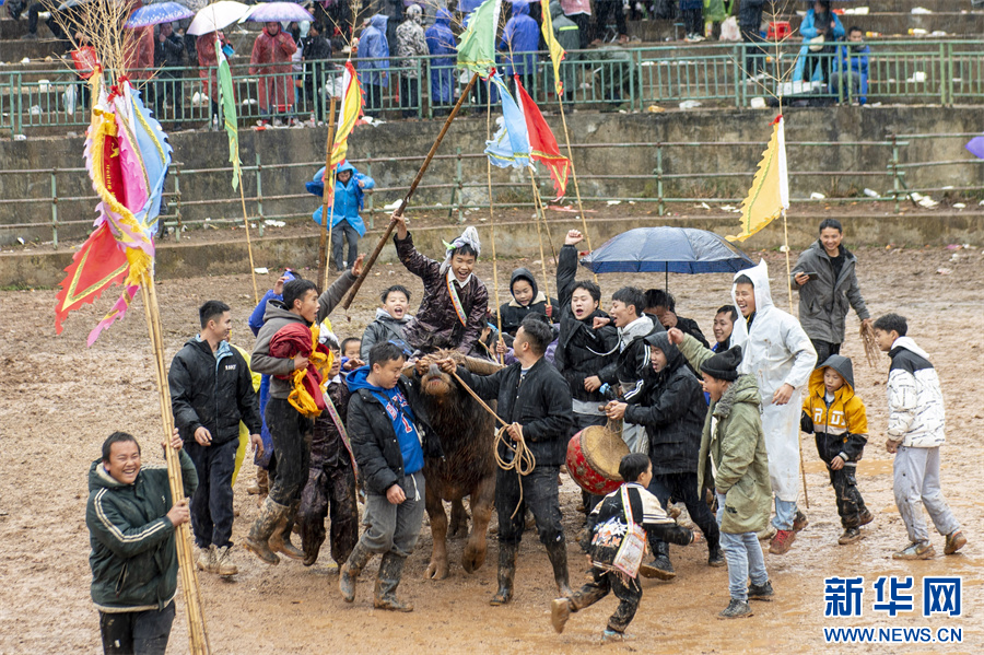 1月2日,在贵州省从江县丙妹镇大塘村松学斗牛塘,人们为获胜牛王欢呼喝彩。新华网发(吴德军 摄)