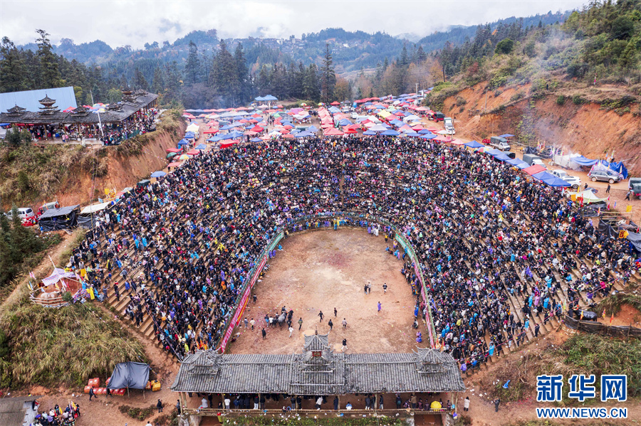 1月2日,人们在贵州省从江县丙妹镇大塘村松学斗牛塘观看斗牛。新华网发(吴德军 摄)