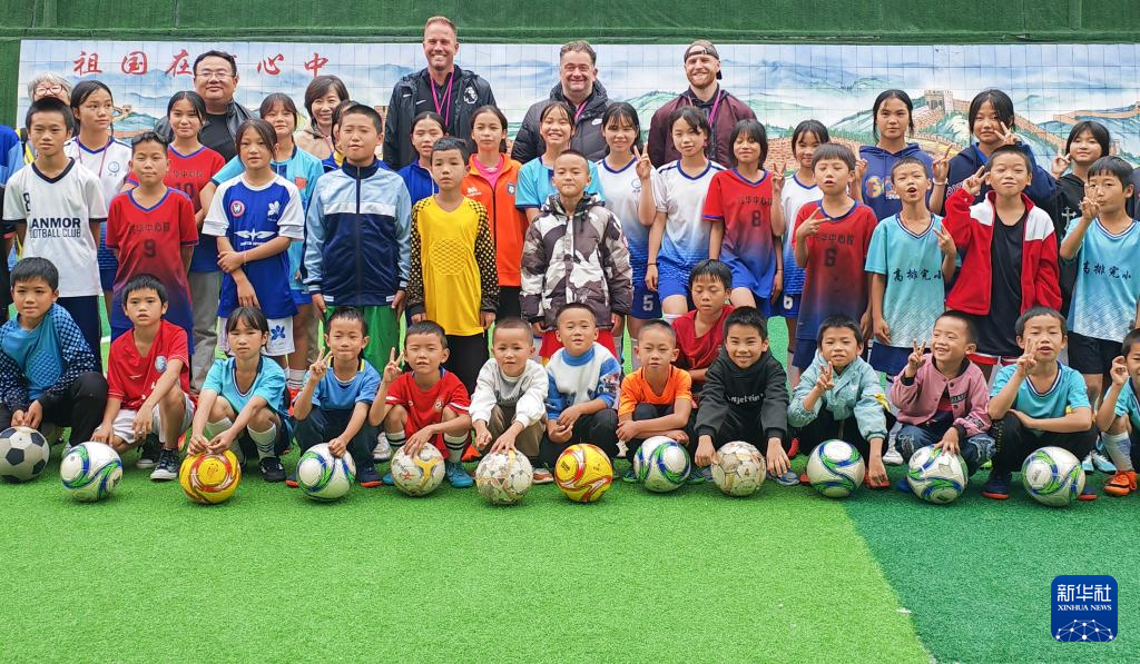 英超考察团成员与榕江县兴华水族乡高排小学的足球学生合影。新华社记者 罗羽 摄