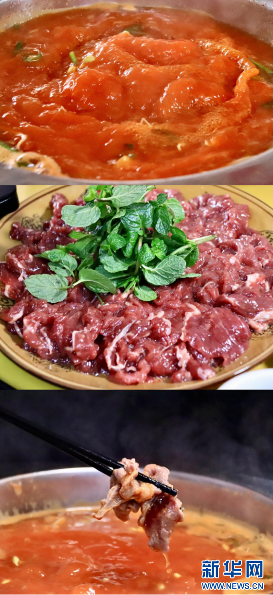 在贵州各种酸味食物中,酸汤牛肉是贵州人近年来的餐桌新宠。选一块上好的牛肉,顺着纹理的方向,切成一个硬币厚的片,来点胡椒、蚝油和生抽、葱姜水、淀粉抓匀,再倒入一点食用油锁住水分,腌制几分钟。搭配上其他分切的牛杂,再上几个特色凉菜,上一锅红酸汤,一桌具有贵州特色的酸汤牛肉就上桌了。红色酸汤色泽诱人,牛肉酸香滑嫩,各种凉菜口感丰富。除此之外,牛场辣子鸡、墨冲角角鱼、太师饼、冰粉等各种美食也是琳琅满目。
