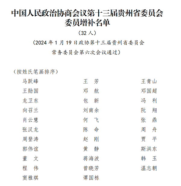 会议审议通过了《中国人民政治协商会议第十三届贵州省委员会委员增补名单》《中国人民政治协商会议第十三届贵州省委员会不再担任常务委员名单》《关于接受王松青等同志请辞政协第十三届贵州省委员会委员的决定》,共有32人增补为政协第十三届贵州省委员会委员,1人提出辞去政协第十三届贵州省委员会常务委员职务,7人请求辞去政协第十三届贵州省委员会委员。