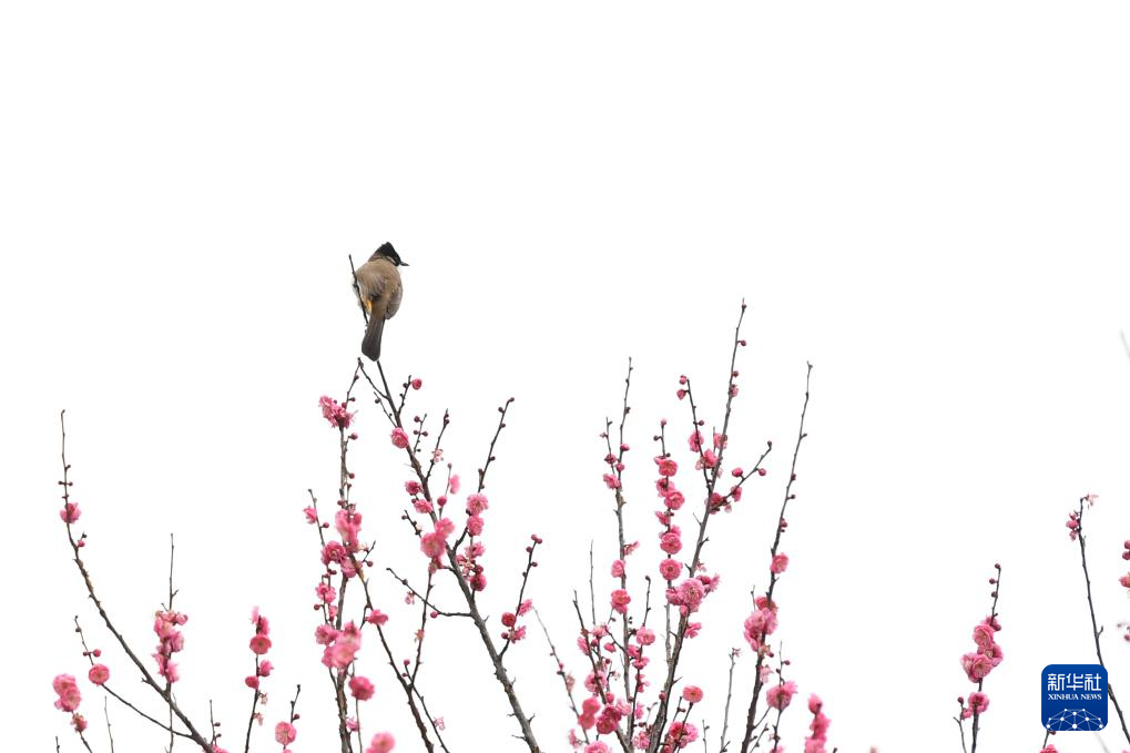 1月20日,贵州省遵义市余庆县都市第三地生态园梅花绽放,小鸟在枝头停歇。