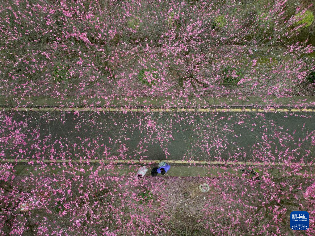 1月20日,在贵州省遵义市余庆县都市第三地生态园,市民在观赏梅花(无人机照片)。新华社发(贺春雨 摄)