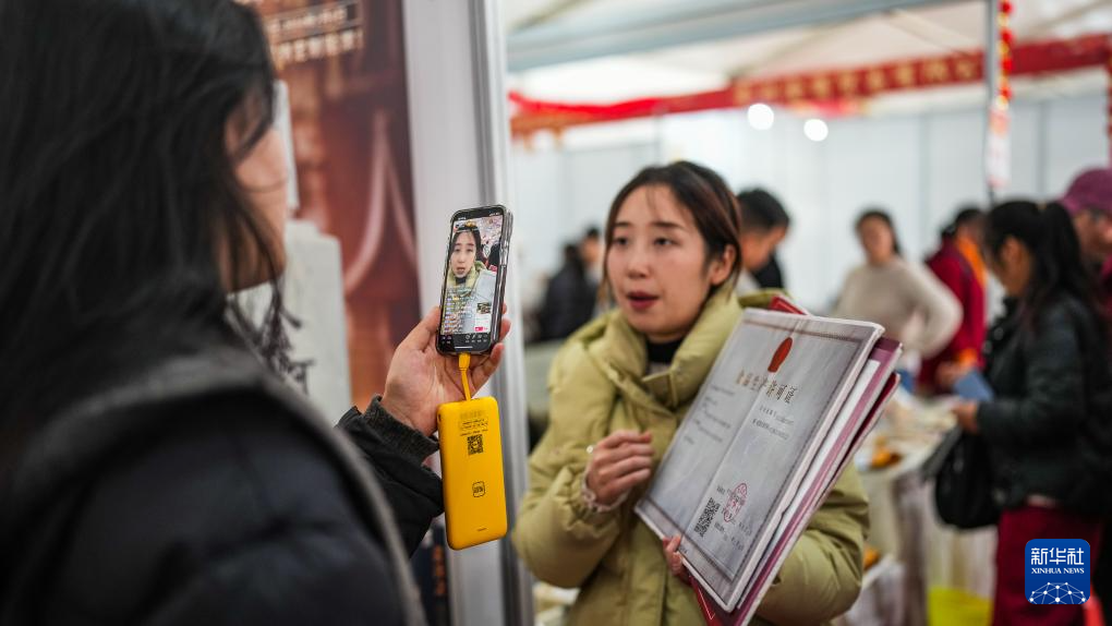 1月30日,商户在位于贵阳的新春年货节现场向市民展示自己产品的来源。新华社记者 陶亮 摄
