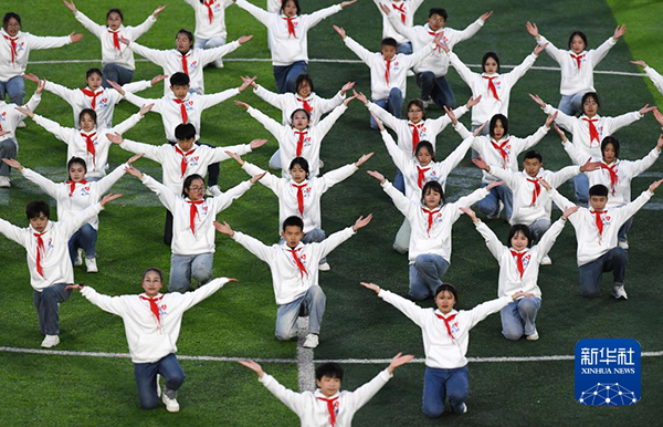 2月3日,在贺岁战中场休息时间,学生们表演歌伴舞《欢迎来看村超》。新华社记者 杨文斌 摄