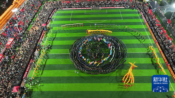 小小的绿茵场因“村超”“村晚”呈现别样的精彩。晚会最后,各族同胞围成圆圈,吹着芦笙,踏歌起舞,一起喜迎中国年。大家脸上洋溢着的幸福笑容,在绚丽多彩的焰火映照下格外灿烂。(参与采写:吴思)