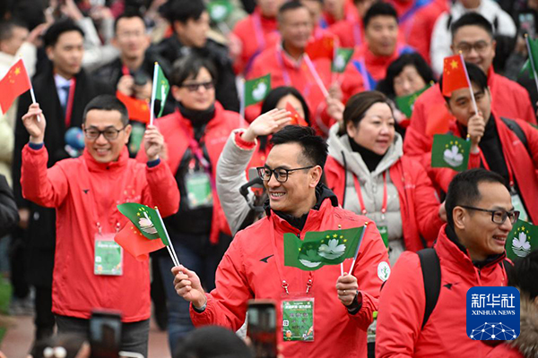 2月3日,澳门职工联队成员进入“村超”赛场。新华社记者 刘续 摄