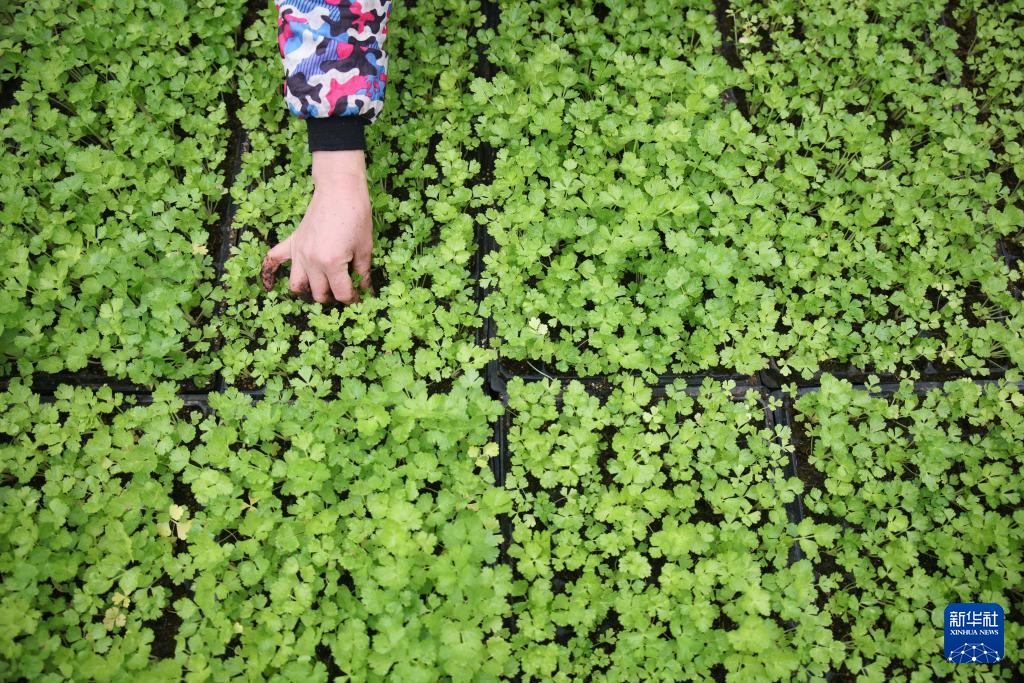 2月4日,在贵州省黔东南苗族侗族自治州施秉县城关镇城东社区,农民在蔬菜大棚里管护菜苗。新华社发(磨桂宾 摄)