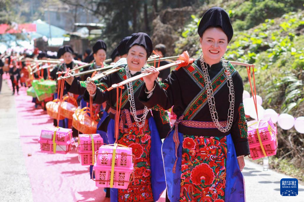 2月11日,贵州省黔东南苗族侗族自治州剑河县革东镇方陇村白屯自然寨,村民们挑着礼物参加姑妈回娘家活动。当地把嫁出去的姑娘称为“姑妈”,丈夫称为“姑爷”,每逢传统佳节的到来,“姑妈”们会按照习俗回娘家与亲人团聚。新华社发(万文杰 摄)