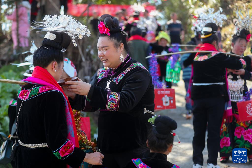 2月11日,贵州省黔东南苗族侗族自治州雷山县永乐镇野牛村,娘家人在村口给“姑妈”敬酒。当地把嫁出去的姑娘称为“姑妈”,丈夫称为“姑爷”,每逢传统佳节的到来,“姑妈”们会按照习俗回娘家与亲人团聚。