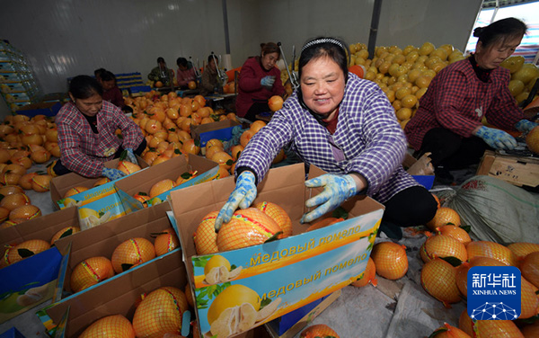 产自贵州岑巩县的思州柚准备发往俄罗斯(2023年11月28日摄)。新华社发(唐鹏 摄)