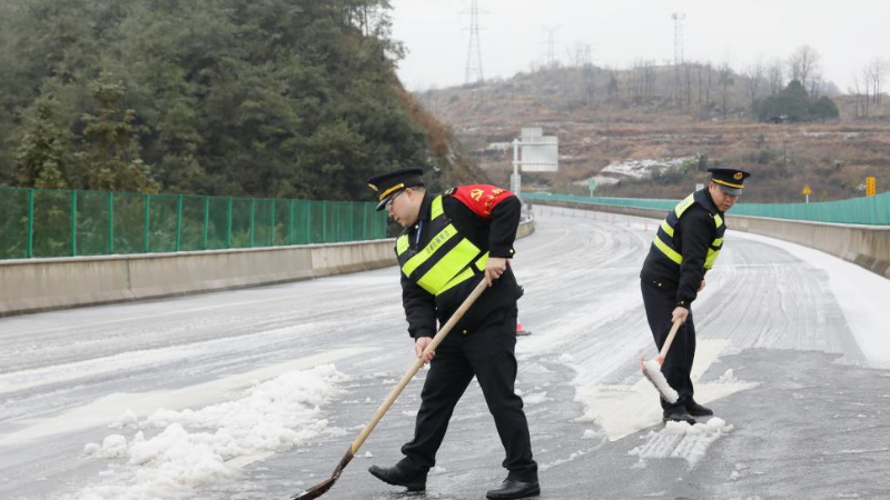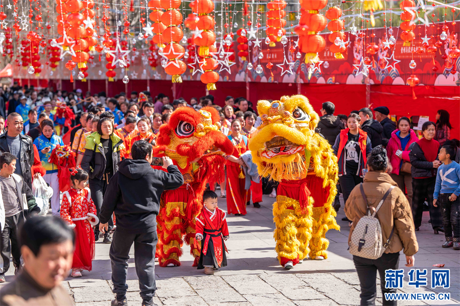 2月11日,游客在贵州省毕节市同心步行街上观看舞狮表演。新华网发(罗大富 摄)