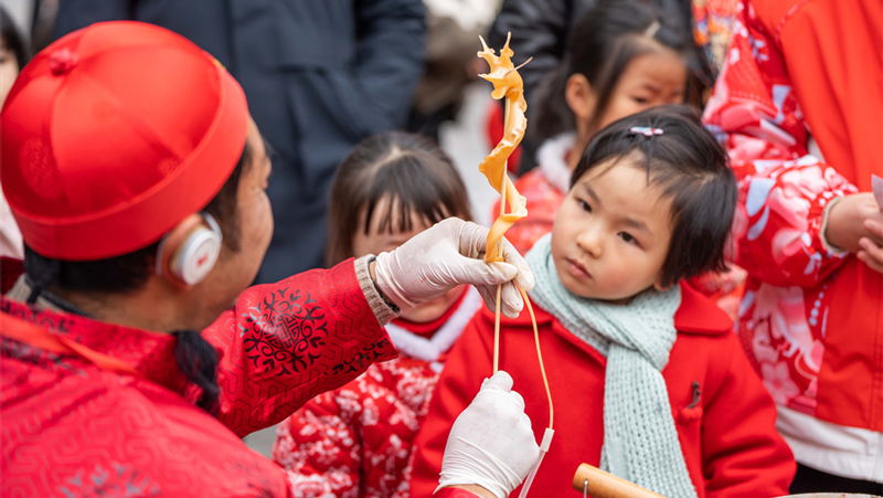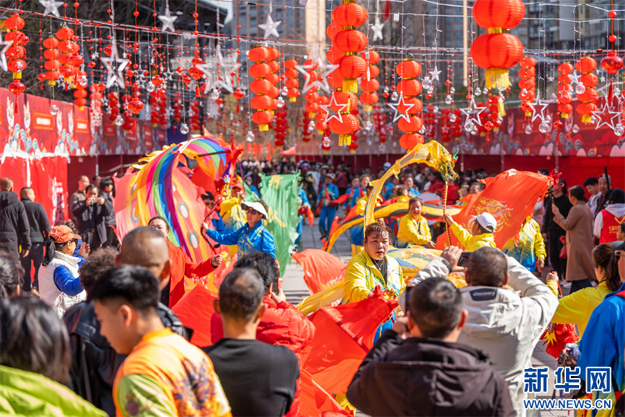 2月11日,市民在贵州省毕节市同心步行街上为游客表演舞彩龙。新华网发(罗大富 摄)