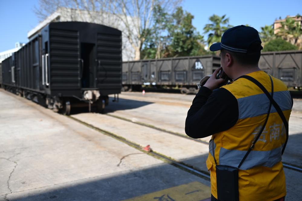 2月18日,在贵阳南车辆段检修车间,一名工作人员指挥已维修好的车辆出库。