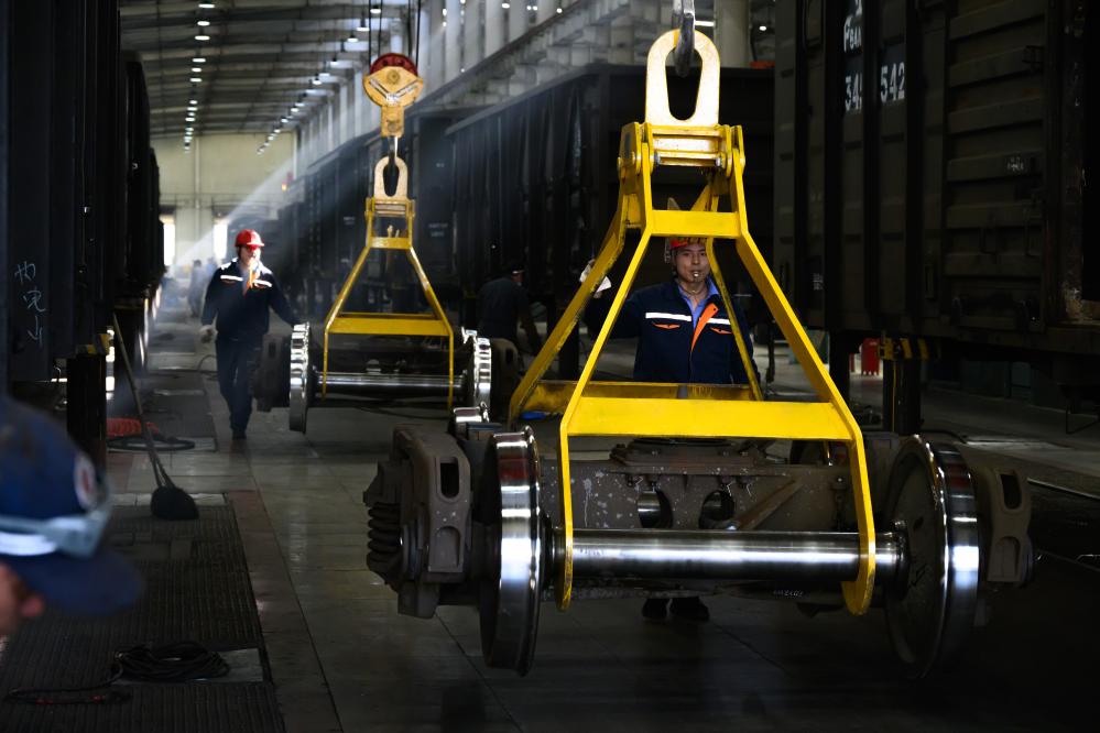2月18日,在贵阳南车辆段检修车间,工作人员对5T车间发现的车辆故障进行维修。
