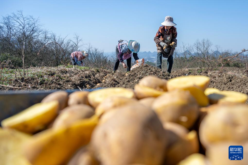 2月19日,在贵州省毕节市百里杜鹃管理区普底乡颖川村,农民在栽种马铃薯。新华社发(李华 摄)
