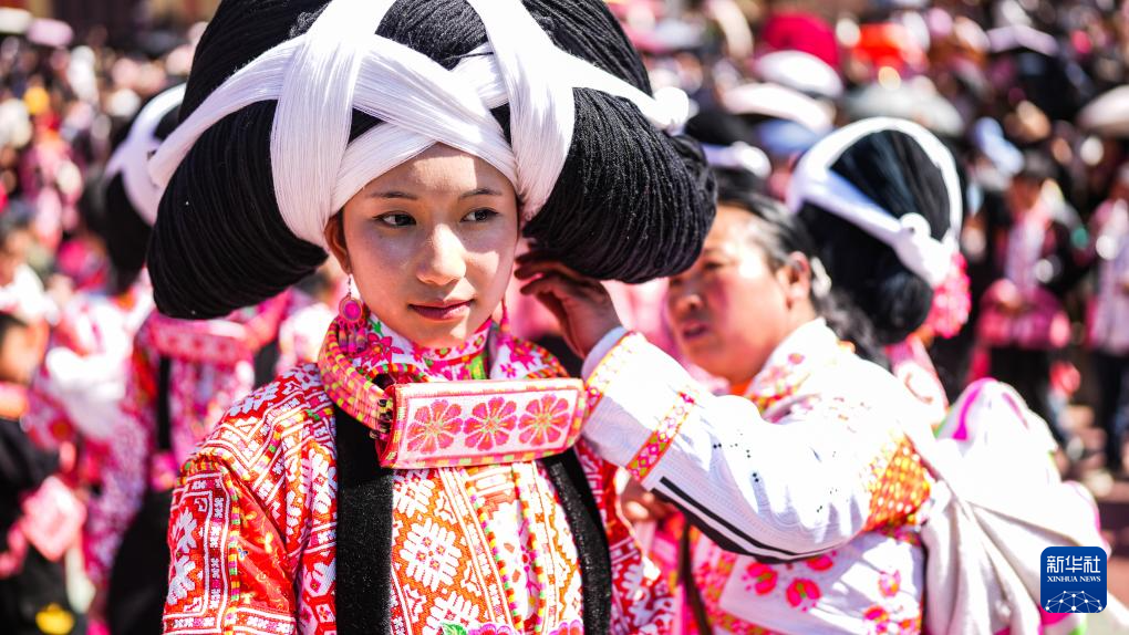 2月19日,长辈在帮助苗族姑娘整理头饰。新华社记者 陶亮 摄