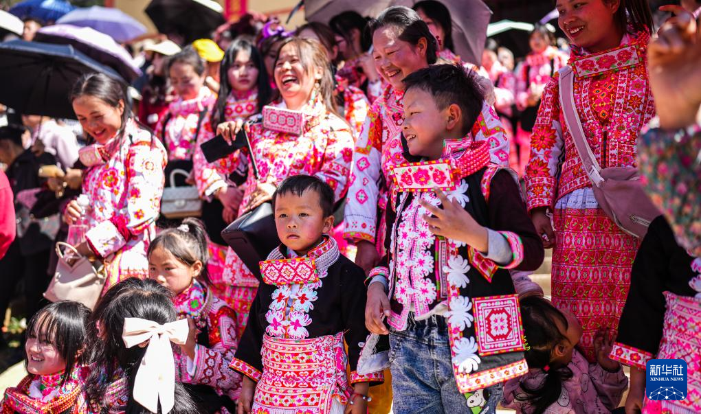 2月19日,苗族群众在六枝特区梭戛苗族彝族回族乡高兴村跳花场旁观看表演。新华社记者 陶亮 摄